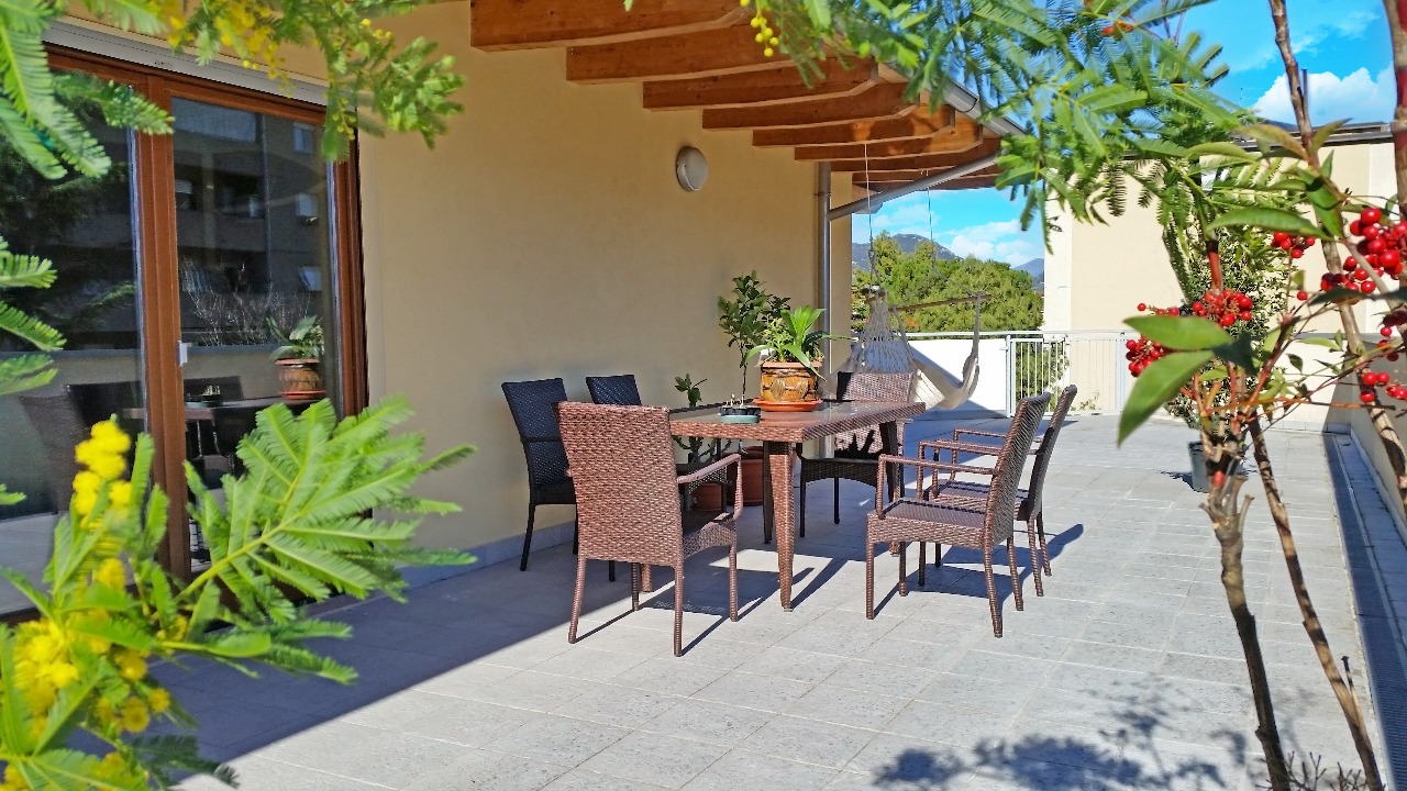 The apartment, which is particularly well cared for in interior design and interior paintings, is equipped with every comfort for immediate use by guests: kitchen utensils, crockery, pillows, blankets, bedspreads and duvets. The apartment is in a quiet area and off the traffic currents. Balcony and large terrace with views of the neighboring mountains and the city.